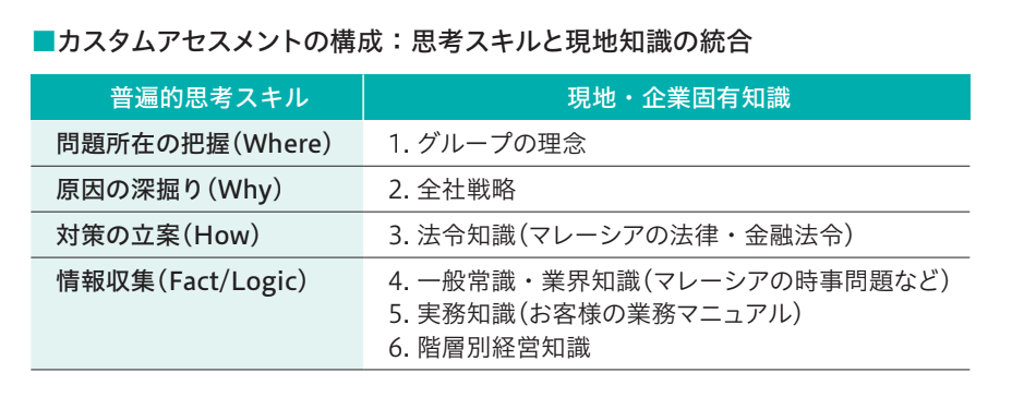 - 普遍的なビジネス思考力と「マレーシアの法律」「現地常識」等の固有知識を融合した、約300問の設問。
